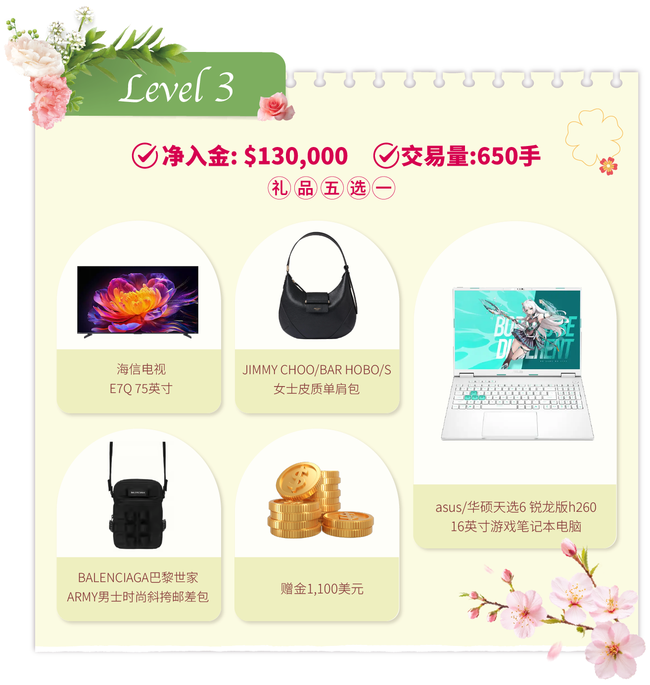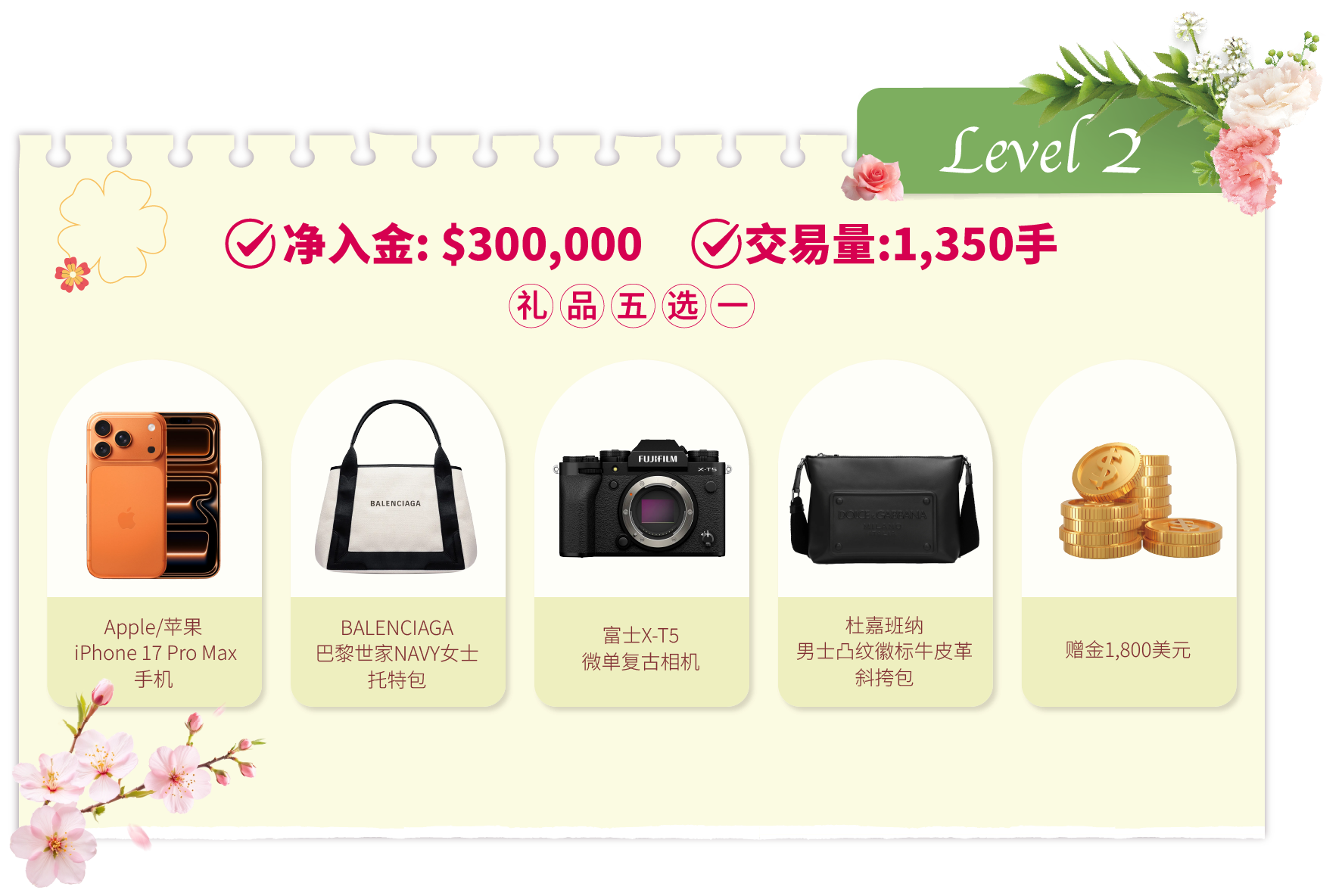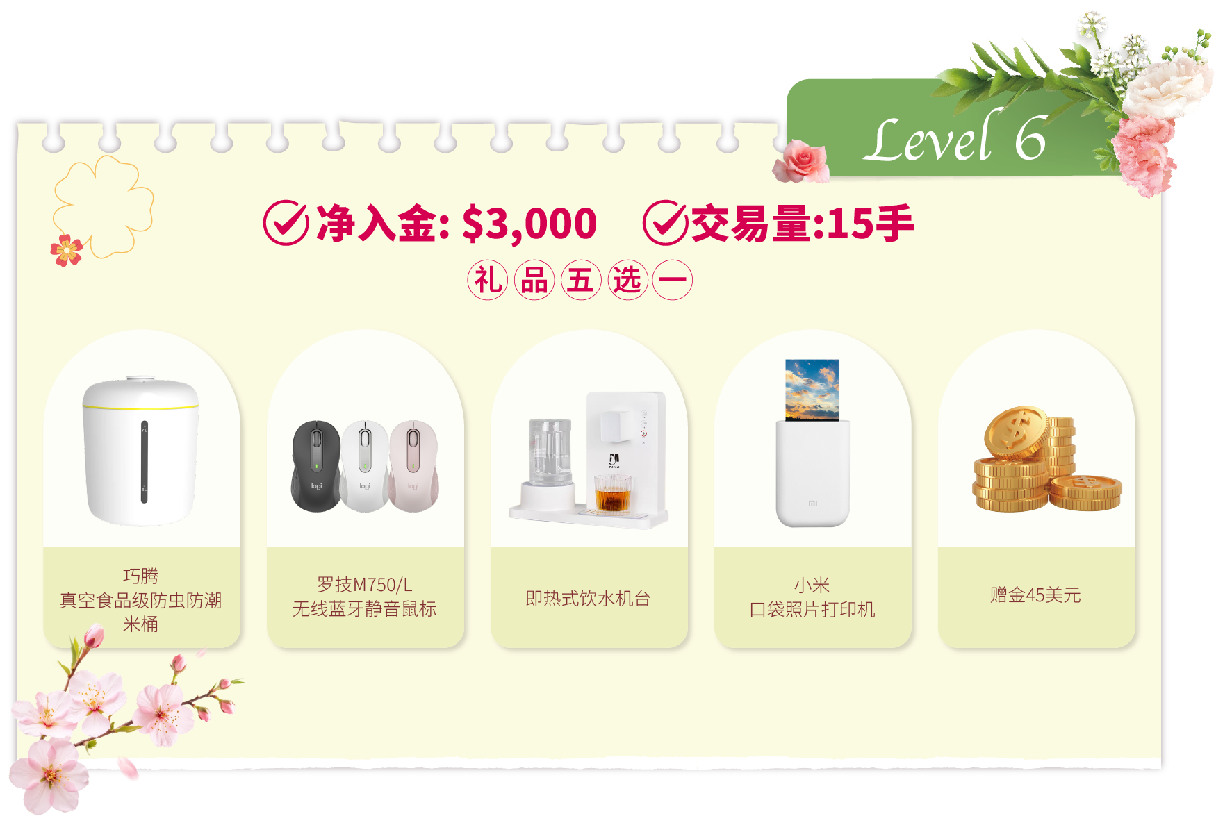 在活动期间内,客户的净入金和平仓手数(美股产品不计算在内)达到相应要求,即可在该层级的五件精选礼品中任选其一。若通过亨达APP完成交易,平仓手数将享有三倍累计计算,助您更快达成目标!